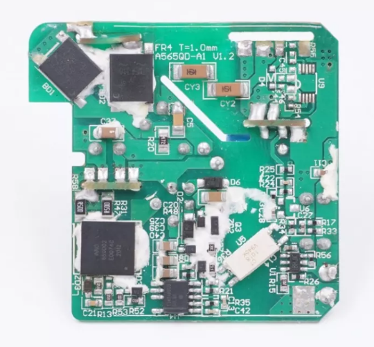 PCB板整體一覽,主控電路板上焊接有三塊小PCB板,分別用來放置電容電感和USB-C母座等元器件,充分利用內部空間減小體積。此外板子之間的空隙里注膠增強充電器內部穩定性以及散熱性能。
