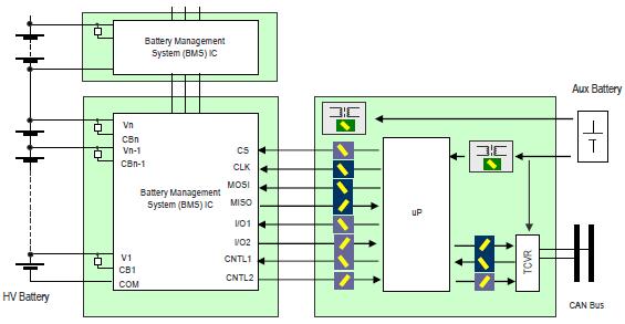 從上圖可以看出,電池高壓側的電池管理控制芯片需要配合上位機控制系統進行數據傳輸和控制。 高壓側的電池管理控制芯片和上位機系統一般是兩個獨立的電氣控制系統。 它們之間的數據輸出和控制需要電氣隔離,包括各種高速數據的傳輸和其他開關信號的傳輸。 同時,電池管理系統BMS的信息狀態需要與車輛主控制器、電機控制器、能量控制系統、車輛顯示系統等進行實時通信。 在電動汽車應用領域,系統之間的信息共享和控制往往是通過CAN總線來實現的,從而使汽車時刻處于安全、穩定、可靠的狀態。